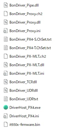 フォルダ内のファイル一式をTVTest内に作成した「BonDriver」フォルダ、およびBonDriverProxyEx内の「BonDriver」(元から準備されています)に格納します。まずはここが第一段階。