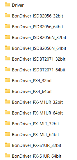 「px4_drv_winusb-250111.zip」を解凍すると、各チューナーに対応したBonDriverが格納されています。ご自身のチューナーおよびシステムに合致したフォルダのファイルを使用します。今回は「BonDriver_PX-MLT_64bit」を使用します。